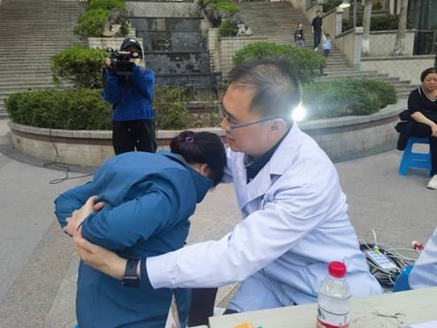 2. 专业服务,温暖人心 现场累计服务群众297人次,完成血压测量119例,骨质疏松高风险筛查26人。专家团队针对颈椎病、腰椎间盘突出、膝关节炎等常见退行性疾病及骨科术后的病人提供健康咨询、诊疗,现场制定个性化治疗方案53份,通过“颈椎保健健身操”演练,健康手册发放等形式将专业医疗知识转化为群众听得懂、用得上的健康技能。“原本担心手术,没想到专家查体后,几句话就解开了我的心结!”饱受腰痛困扰的刘阿姨表示。专家查看我的手麻症状,不仅开了药方,还教了日常养护方法,这样的活动太实在了!”社区张先生表示。“现场指导我们做的颈椎保健操,三个动作一做,颈部僵硬、脖子舒服多了,关键回家还可以教给我的家人。”社区志愿者们表示特别受用。