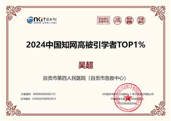 【学术荣誉】吴超入选“2024中国知网高被引学者TOP1%”,引领数字骨科创新前沿时间:2025-04-16 浏览量:1110 来源: 作者:近日,中国知网(CNKI)正式发布2024年“高被引学者”榜单,数字骨科领域资深专家、[自贡市第四人民医院(自贡市急救中心)/主任医师]吴超凭借卓越的学术贡献与行业影响力,成功入选 “2024中国知网高被引学者TOP1%”。该榜单以论文引证标准化指数(PCSI)为核心指标,从全国335万学者中遴选前1%,旨在表彰长期深耕学科前沿、推动学术成果传播的顶尖研究者。吴超的入选,标志着其研究成果在数字骨科领域的学术价值与实践影响力获得国内学界高度认可。