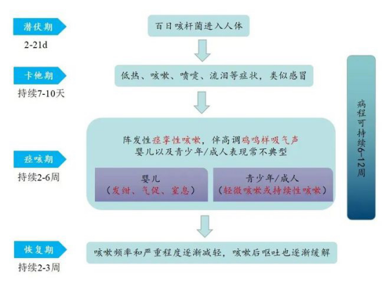 持续数周至数月 § 除咳嗽外的其余症状已消退,阵发性咳嗽逐渐消失