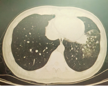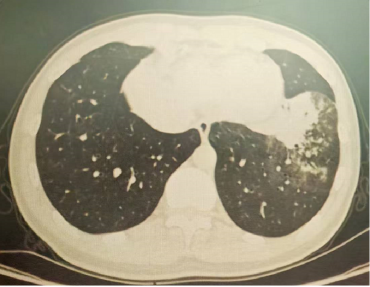 以上是他的胸部CT影像,主要表现为左下肺炎症,片絮影+磨玻璃影。