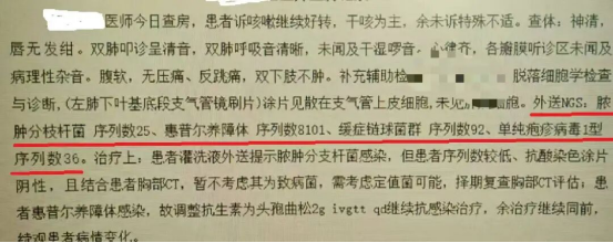 考虑到患者使用多种抗生素效果不佳,肺部感染影像学改变明显,而症状却并不严重,主管医生判断该患者系不典型或者机会性肺部感染可能性大,于是立即安排了支气管镜检查,并送检肺泡灌洗液mNGS。