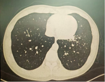 肺部感染的影像学特征 多发性结节伴快速进展 CT表现为双肺多发实性结节(直径0.5-3cm),结节边缘可见毛刺征及分叶征,特征性表现为短期内体积呈几何级数增长(如1周内增大10倍),需与转移瘤、结核球等鉴别。