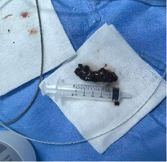 在术中刘泳主任医师谨慎操作下,随着气管镜缓缓探入患者气管,只见气道内已严重狭窄,巨大痰痂几乎将气管堵死——这便是把刘大爷拽向鬼门关的元凶!而这场与死神赛跑的手术,刘泳主任医师需要在患者气管切开后的狭小通道内完成麻醉、冲洗、探查、抓取等一系列操作,既要避开脆弱的气道软骨,又要防止痰碎裂后堵塞远端支气管,经过数次小心翼翼地冲洗、探查,逐步清理痰痂周边的坏死组织和分泌物,经过十余次精细探查找到了让他在鬼门关前走了一趟的罪魁祸首,是一条长达5.5cm×宽1.5cm的血痰痂,随着在镜头露出真面目的血痂被顺利取出,刘大爷的呼吸困难症状瞬间消失,原本急促的喉鸣音也戛然而止,血氧饱和度上升至100%。术后复查气道镜,气管管腔恢复通畅,黏膜仅见轻微充血,无明显撕裂与出血,这场高难度的床旁气道异物取出术以零并发症的结果宣告成功,他和家属对我院呼吸与危重症医学科及重症医学科医护人员的救治由衷地表示了感谢。