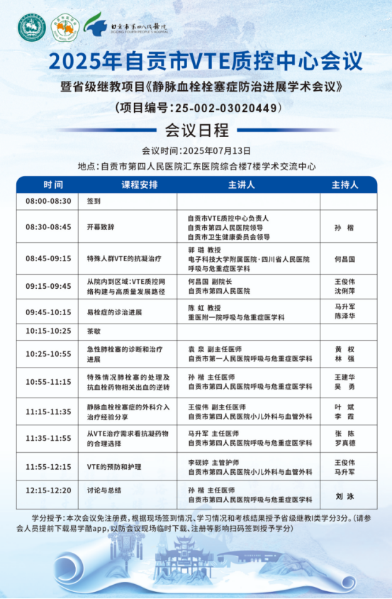 2025年7月13日,由自贡市第四人民医院呼吸与危重症医学科联合小儿外科与血管外科承办的2025年VTE质控中心会议暨省级继续医学教育项目《静脉血栓栓塞症防治进展学术会议》。 本次会议邀请到国内及省内医学领域知名专家教授,围绕着特殊人群VTE的抗凝治疗、VTE质控网络构建与高质量发展路径、易栓症的诊治进展、急性肺栓塞的诊断和治疗进展、特殊情况肺栓塞的处理及抗血栓药物相关出血的逆转、静脉血栓栓塞症的外科介入治疗经验分享、从VTE治疗需求看抗凝药物的合理选择以及VTE的预防和护理等众多模块进行分享,来自省内外200余名医疗护理同仁共聚一堂,本次会议内容丰富精彩并且专科性、实用性强,让参会人员收获满满。
