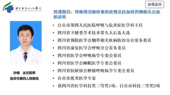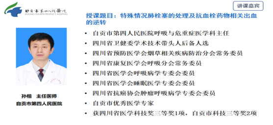 自贡市第四人民医院 呼吸与危重症医学科 孙楷 主任医师 《特殊情况肺栓塞的处理及抗血栓药物相关出血的逆转》