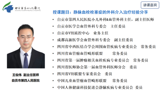 自贡市第四人民医院 小儿外科与血管外科 王俊伟 副主任医师 《静脉血栓栓塞症的外科介入治疗经验分享》