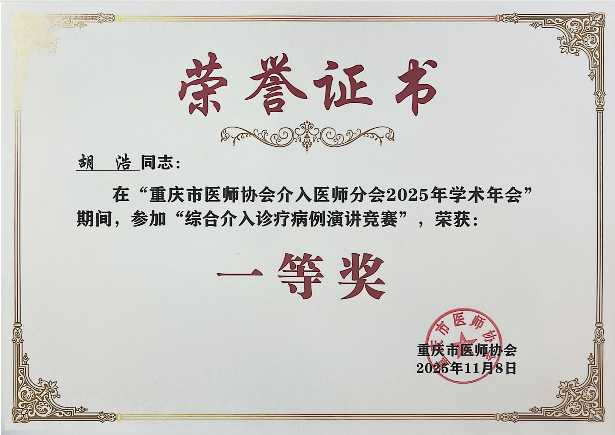 据悉,胡浩医生是本次比赛中唯一一位来自重庆市外的选手。此次获奖,不仅是对其个人专业能力的肯定,更是对市四医院介入团队技术水平与学术风采的高度认可。