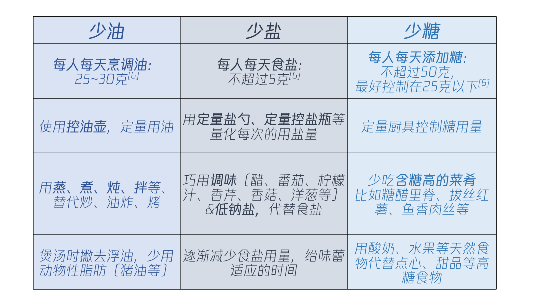 ![]() 清淡饮食的好处 控制体重 清淡饮食通常摄入较少的热量,更偏向于低脂肪、低糖分的食物,因此有助于控制体重,预防肥胖和相关疾病的发生。 改善消化 清淡饮食通常包含更多的蔬菜、水果和全谷类,这些食物富含纤维,有助于促进肠道蠕动,改善消化,预防便秘和其他消化问题。 降低心血管疾病风险 清淡饮食通常可以限制高盐、高胆固醇和高脂肪食物的摄入,有助于降低血压和胆固醇水平,减少心血管疾病的发生风险。 增强免疫力 清淡饮食提供丰富的维生素、矿物质和抗氧化剂,有助于增强免疫系统的功能,提高抵抗力,预防感染生病。 改善睡眠质量 清淡饮食不含过多刺激性食物,有助于改善睡眠质量,减少睡眠障碍的发生。 清淡饮食的误区: 误区一:清淡饮食等于素食,然而,这是一种误解。长期吃素可能导致营养不良,增加缺铁性贫血、肌肉衰减、骨质疏松和记忆力衰退的风险。 误区二:清淡饮食就是多吃粗粮,粗粮富含膳食纤维,有助于改善肠道健康,但并非所有人都适合大量摄入。特别是小孩和老年人,肠胃功能较弱,过量摄入粗粮可能加重消化负担。 误区三:清淡饮食就是少吃饭,主食是人体能量的主要来源,特别是谷薯类食物,富含碳水化合物和膳食纤维。清淡饮食并非要求减少主食的摄入,而是倡导多样化选择,适量摄入主食,同时增加蔬菜、水果等低热量、高营养密度的食物。 误区四:清淡饮食就是无味饮食,但实际上,通过合理的烹饪方式和调味技巧,可以在保证食物清淡的同时,提升其口感和风味。 误区五:清淡饮食就是无油饮食,有些人认为清淡饮食就是完全不吃油,这也是一种误解。适量摄入油脂有助于维持身体健康,关键在于控制摄入量。在烹饪过程中,可以使用健康的油脂如橄榄油、菜籽油等。 ![]() 讲了那么多,清淡饮食应该怎么吃呢? 1. 多吃天然食物,控制加工食物 常见的加工食物有方便面、果冻、罐头食物(包括肉类、浓汤、饮料等)、腌制肉类等,它们也都是由天然食物制作而成。 虽然加工食品也有营养价值,但经过加工,添加配料和食品添加剂,往往是高盐、高糖、高油、高能量。 ![]() 2. 合理搭配食材,平衡膳食摄入 《中国居民膳食指南》推荐:要做到平均每天摄入12种以上食物,每周25种以上。其中包括: 1. 餐餐有蔬菜:每餐都要吃新鲜蔬菜,而且以深色蔬菜为主(如菠菜、油菜、芹菜叶、空心菜、芥菜、莴苣、茼蒿、韭菜、豆苗、西兰花等等); 2. 适量吃鱼、禽、蛋、瘦肉:每餐一点肉,每天一颗蛋。多吃白肉(禽肉和鱼),适量吃红肉(猪、牛、羊肉),少吃肥肉; 3. 主食增加全谷物和杂豆类:在制作主食的时候,可以放一把谷物杂粮或者豆类; 4. 天天吃水果:每天吃适量、新鲜的时令水果,应注意鲜榨果汁不能替代新鲜水果; 5. 一天一杯奶:把牛奶当成每日必需品,做到每天250ml~500ml牛奶,还可多吃各式各样的奶制品; 6. 常吃豆制品:多吃豆类,常吃豆腐、豆干、豆浆、豆皮等豆制品。 ![]() 3. 少盐、少油、少糖的烹饪方式 吃过多的盐、油和糖,都会影响健康。你可以参考下面的表格来控制自己油、盐和糖的摄入: ![]() 总的来说,清淡饮食是一种科学的饮食方式,它强调食物的多样性和营养的全面性,其核心在于“少油、少盐、少糖、不辛辣”,通过合理的饮食搭配,保证营养物质的全面摄入,从而促进身体健康。