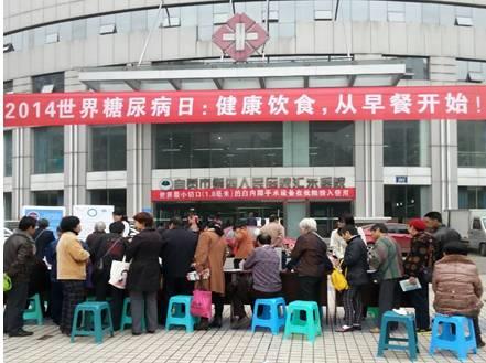 我院内分泌科开展世界糖尿病日的宣传及义诊活动时间:2014-11-17 浏览量:3219 来源:朱金梅 作者:11月14日上午,由内分泌科主任邓春颖、护士长罗富琼带队,在我院汇东医院大厅门前进行了义诊和糖尿病日相关内容的宣传。每年11月14日是世界糖尿病日,今年仍延续去年“糖尿病,保护我们的未来”的口号,活动围绕“健康的生活与糖尿病”的主题,在场医务人员为大家讲解早餐的重要性以及糖尿病的健康饮食。此次活动吸引诸多市民参与,发放宣传资料100余册,免费监测血压81人次,免费监测血糖102人次,其中有血糖高达22.7mmmol/l的市民。