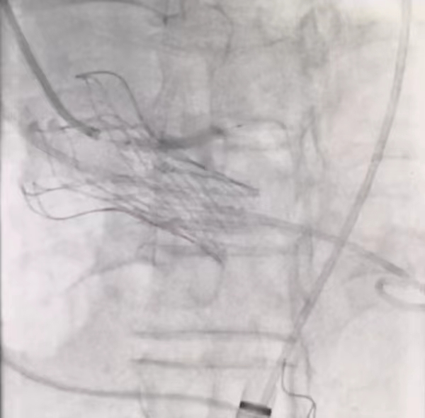曾阿婆82岁,10年前开始反复出现心累、气促,伴双下肢水肿。多次住院治疗,诊断为慢性心力衰竭,心脏瓣膜病,药物治疗效果不好,近两月心累胸闷明显加重,心脏超声提示主动脉瓣明显狭窄,峰值流速5.75米/秒。峰值压差132mmHg,主动脉瓣口有效面积仅0.54cm2,还伴有中量反流。由于年纪太大,她已经失去了外科手术的机会,进行TAVR治疗是唯一的有效治疗手段。四院心内科团队进行了周密的术前准备,考虑到了各种可能发生的情况,提前预备器械及预案,克服了患者股动脉迂曲,分叉高,瓣膜钙化重,心脏横位,过弓困难等情况,瓣膜顺利到位。瓣膜释放至可回收极限位时,行升主动脉造影发现左冠闭塞风险高,保留瓣架外预埋通路的同时,通过瓣架网眼再建立通路,行开窗支架保护左冠,术中帅文欢、龚林等术者配合默契,最终手术取得圆满成功。这也是我院放射科、麻醉科、超声科、手术室等多学科团队通力合作的结果。该手术的独立实施,也标志着我院心内科结构性心脏病亚专业已日臻完善,迈入省内一流的水平。 1,人工瓣膜释放后左冠位造影提示左冠堵塞风险高
