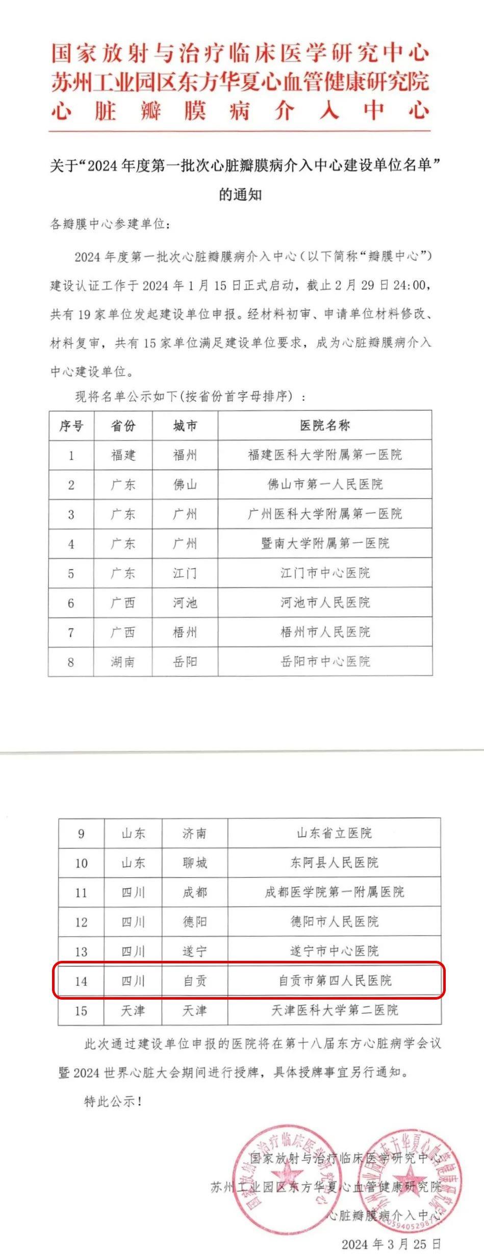 日前,国家放射与治疗临床医学研究中心、心血管健康联盟等单位公布了2024年度第一批次全国心脏瓣膜病介入中心建设单位名单。此次,全省仅4家、全国仅15家单位入选,自贡市第四人民医院在列,这标志着自贡市第四人民医院心脏瓣膜微创介入术的发展进入了新的阶段。