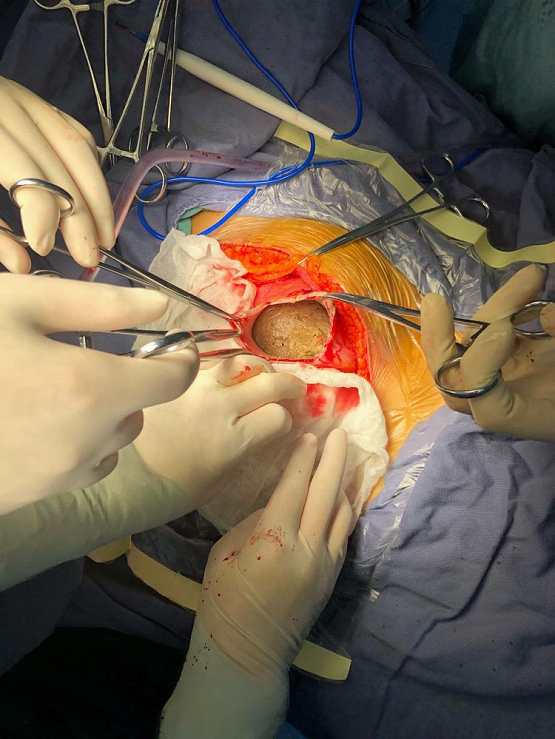 这样的腹腔“巨石”,您见过吗?时间:2019-04-30 浏览量:5424 来源: 作者:2019年4月,普外一科病房来了一位“大腹便便”的病人。她今年48岁了,但她的生活却因为这个“大肚子”而变得苦不堪言。 询问病史才得知,30年前,她因患“巨结肠”排便困难,在当地医院做了乙状结肠的双腔造瘘手术。而之后,腹部开始出现一个包块并逐渐长大,而多处就医无效。当我们见到她的时候,这个腹部包块巨大而且坚硬如石,并且有膀胱受压的症状,有尿频、尿急、尿不尽等。 到底是个啥病呢?于是,我们给她做了腹部CT检查,发现腹腔包块其实是造瘘口远端扩张的乙状结肠和直肠,其中填满了粪石,而占据整个盆腔和中下腹腔。