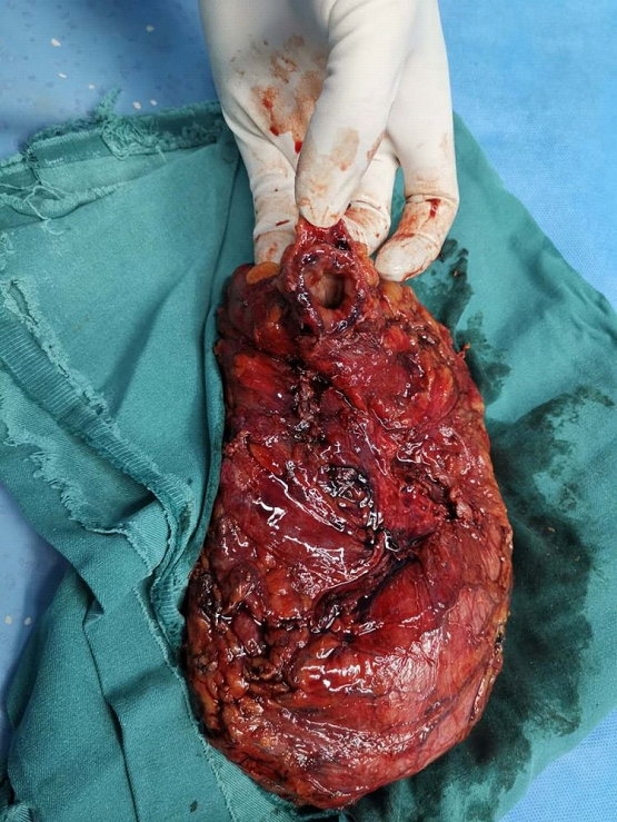 于是,她入院后完善了术前检查,并予营养支持等准备妥当。我们科室进行了一次专业的术前讨论,为她制定了一套方案:切除造瘘远端肠管,改双腔为单腔造瘘。征得她及家属同意后,我们于4月中旬,给她做了手术。 术中,我们发现肛门严重狭窄,而远端乙状结肠和直肠扩张直径约20cm,腔内填满坚硬的粪石,膀胱也挤压变形。经过1个多小时的手术,我们完成了手术计划:距肛门3cm切除扩张的肠管,近端降结肠行单腔造瘘。 术后,她安返病房,康复顺利,膀胱压迫症状也已缓解。她也在上周痊愈出院。