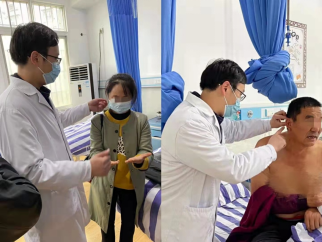邓云良医生为患者查体诊断 义诊结束后,在永安镇中心卫生院会议室,神经外科丁昊主任就颅脑常见疾病如自发性脑出血、颅内损伤、颅内肿瘤、颅内动脉瘤等的临床表现、检查及治疗方法等对全院职工进行了讲课培训。杨呈浩副主任对三叉神经痛及面肌痉挛的基本知识、检查、治疗方法等进行了培训。