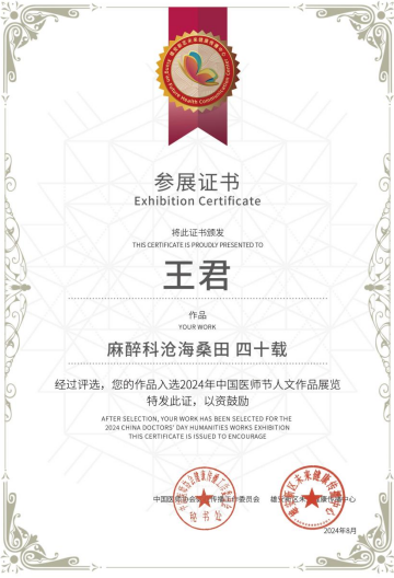 为致敬优秀医者,弘扬医者仁心,中国医师协会面向全国征集了人文作品,市四医院麻醉科医生王君投稿的摄影作品《麻醉科沧海桑田四十载》入选2024年中国医师节人文作品展览。