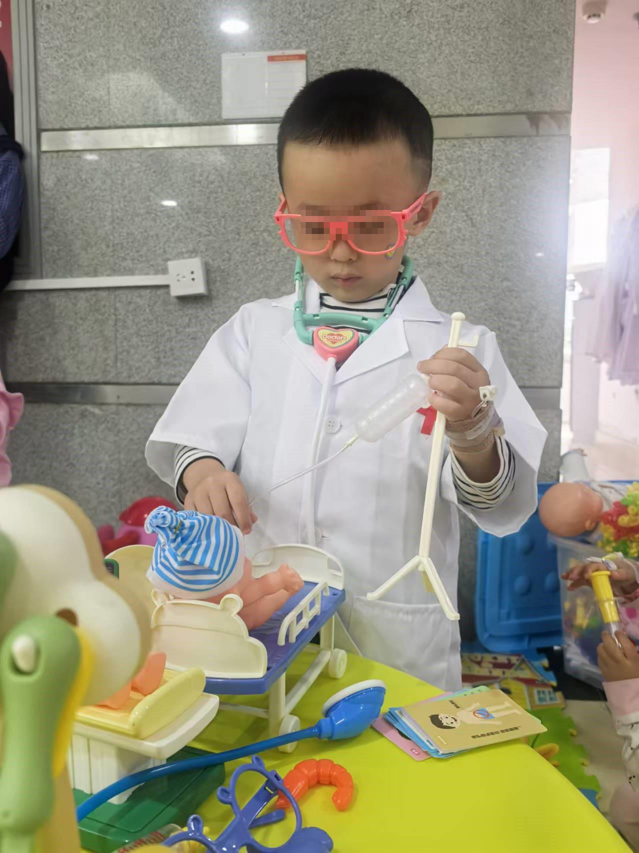 小明体验的是“我是小医生、小护士”角色扮演游戏。在这个游戏里,小朋友们可以穿上小白大褂,为布娃娃进行测体温、听诊等,并通过这些趣味活动正确认识医疗用品和疾病,逐步减少恐惧,配合治疗。这是科室开展的儿童医疗游戏中的一种。除此之外,科室还准备了“勇气之旅”游戏,患儿可以尝试为布娃娃做CT等,在游戏中了解各类检查和治疗,为实际诊疗做准备。能够在“勇气之旅”里通关的还会获得科室颁发的勋章奖励。