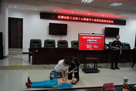活动中,市四医院心身医学科刘春慧以《积极赋能 职场减压》为题,结合司法工作特点,阐释了职场压力对工作、生活、家庭、个人健康的影响,通过心理减压方法,放松训练,为大家在日常工作中的情绪困扰提供了科学应对方案。随后,急诊科护士长王雪莲和急救团队通过“理论+实操”方式,向大家讲解了心肺复苏(CPR)、自动体外除颤器(AED)使用及气道异物梗阻急救(海姆立克法)等技能,让大家受益匪浅。
