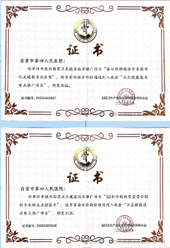 此外,近日,国家卫生产业企业管理协会权威发布卫生健康技术重点推广项目名单,由市四医院牵头研发的《脊柱外科精准手术数字化关键技术及应用》与《3D打印辅助骨盆骨折微创手术相关关键技术》两大项目成功入选。这标志着市四医院在科研成果转化及基层推广方面取得重大进步,获得了中国卫生行业的广泛认可。