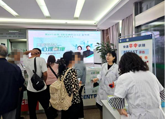 医院在门诊楼、行政办公楼等重点区域开展了多维度健康宣教。活动现场设置了“职业健康服务驿站”,通过“三维一体”宣教模式进行《职业病防治法》宣传。