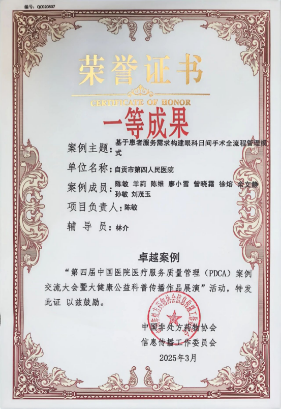 在第四届全国医院医疗服务质量管理(PDCA)案例竞赛中,由眼科护士长陈敏带队,护理骨干羊莉、廖小雪汇报的《基于患者服务需求构建眼科日间手术全流程管理模式》从全国数百个参赛案例中脱颖而出,一举夺得一等奖;在四川省护理学会2025年护理伦理学术年会“案例比赛”中,陈敏带领曾晓霜、徐熔,以《隐瞒与告知的艰难抉择——洞察伦理困境,守护患者权益》参赛,并荣获三等奖。两项荣誉的取得,既是科室护理团队专业能力的体现,更是医院长期重视护理质量、深耕学科建设的成果。科室将继续以患者需求为导向,以质量管理为抓手,推动护理服务向更精准、更人性化的方向迈进。