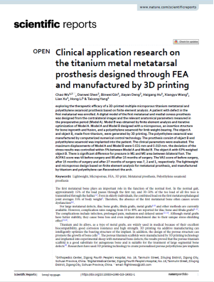 近日,市四医院骨科中心团队在吴超主任带领下,成功实施的“个性化3D打印钛金属跖骨假体植入术”荣获重大权威认证。四川省卫生健康发展研究中心出具的《科技查新报告》明确指出,在国内外公开发表的文献中,未见使用3D打印金属材料制作第一跖骨与楔骨假体并进行植入手术的报道,未见使用计算机数控(CNC)加工聚乙烯籽骨衬垫并应用于下肢负重骨。这份官方报告为本次手术的全球首创性提供了无可争议的佐证,夯实了其里程碑式的地位。三年随访记录该病例从设计、手术到康复全过程,相关的临床研究成果也已正式发表于国际知名SCI期刊《scientific reports》。这标志着该创新术式从临床实践到学术认证均获得了国内外同行的双重认可,是我国在骨关节精准重建领域的一项标志性成果。