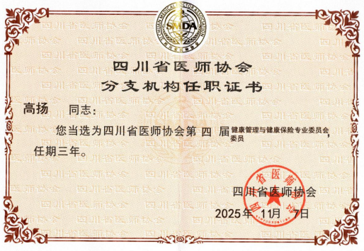 凭借在领域的专业影响力,高扬还成功当选了四川省医师协会第四届健康管理与健康保险专委会委员。