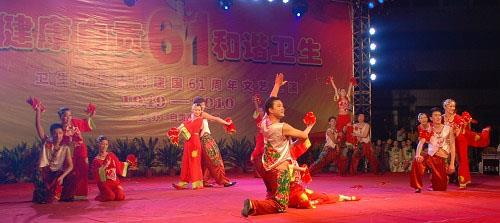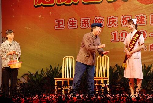 在9月28日晚举行的市卫生系统“健康自贡、和谐卫生”庆祝国庆61周年文艺汇演中,我院选送的舞蹈《欢天喜地秧歌情》获得一等奖,小品《寻找郝医生》获得三等奖。图为表演现场。