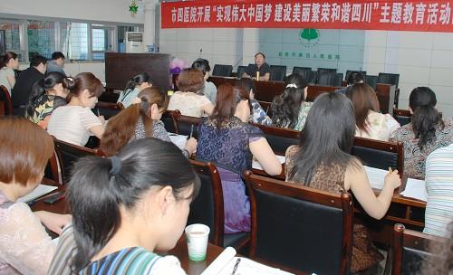 5月13日下午,我院在多功能厅召开“实现伟大中国梦、建设美丽繁荣和谐四川”主题教育活动动员大会,全院中层干部、党支部书记100余人参加了动员大会。院长刘建辉在会上指出,要结合此次活动,明确怎样做好医院发展建设和实现职工成长成才,也就是医院的梦想是什么,要怎样来实现这个梦想。他表示,要让退休职工老有所养,老有所为;让中年职工干实事、干好事,实现个人的人生目标,推进医院的发展目标;让青年人有理想、有目标,引导他们树立正确的人生观,并为他们的成长创造机会。他要求将此次主题教育活动切实落实到工作中,在全院形成“我为医院作贡献、医院为我搭平台”、“我健康、我快乐、我和谐”的价值理念。