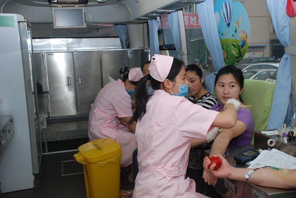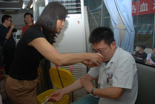 一大早,献血报名点和献血车前就排起了长队,在院办工作人员的组织下,献血活动有条不紊的进行,献血者依次排队认真填写报名表,在一系列的检查之后,符合要求的献血者登上献血车,奉献了自己的爱心。为了能献出高质量的血,护士闵利拒绝喝家人为她泡制的花草茶,7:30就来到医院等候献血车的到来。很多医护人员都是空腹来做检查,献完血之后,只吃了点血站准备的小面包,来不及休息一下就匆匆赶去上班。医生薛龙献血之后,出现头晕、心里不适等症状,杜冲书记和张慧主任登上献血车前来看望他,并让他好好休息一下,可薛龙只坐了一会儿又赶去科室上班。在献血的人群中,有夫妻双双来献血的,有带着伤来献血的,还有的是多次参加献血的。