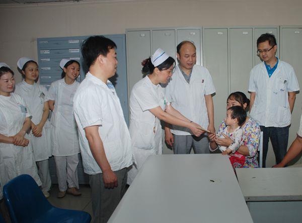6月11日,我院骨一科患者萧萧即将出院,护士长张学华代表科室将2200余元捐款送到萧萧奶奶手中,祝愿萧萧早日康复。萧萧的爷爷奶奶感激地说:“谢谢你们,谢谢你们!”