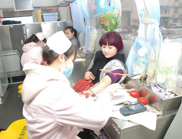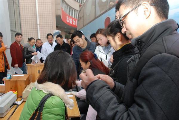 上午8点,市中心血站的献血车就准时来到医院,医务人员也排起了长队,填表、体检、采血、活动现场气氛热烈。 皮肤科的兰绮是第一个登上献血车,她说“昨天没值班,所以今天来得比较早。”这是她第7次献血,累计献血已达1900ml,后勤服务中心的吴端也献了7次血,献血量达2000ml。在这些献血的人群中麻醉科的吴迪、介入室的黄吉祥因为马上要做手术,均插队要求先抽他们的血,抽完血就回科室手术了。很多科室白天工作忙,大家都是相互交替着来献血,这边一献完血,那边就又投入到科室繁忙紧张的工作中。还有些人是值了夜班之后来献血的。