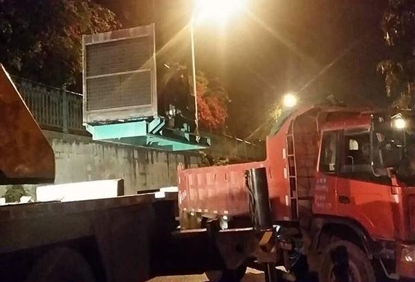 在后勤服务中心工作人员的统一指挥下、在保卫科工作人员的大力协作下、在现场施工人员的精准操作下,柴油发电机开始缓缓升起,经历了起吊、举升、平移、下降等过程后,发电机于4月15日凌晨0时40分,稳稳地吊入装载车车厢。