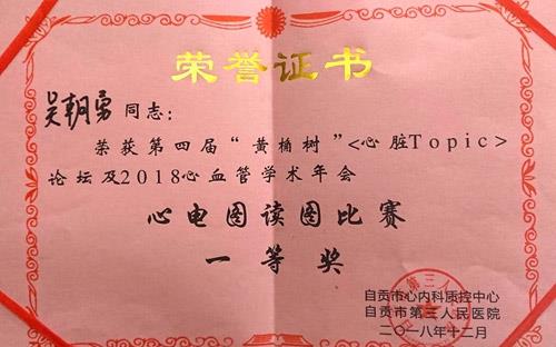 近日,在举行的全市心血管内科心电图读图比赛中,市四医院心血管内科吴朝勇获得一等奖,陈华获得二等奖。据悉,此次比赛的参赛选手来自全市四区两县及周边地区。