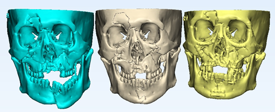 数字医学中心基于患者的术前CT数据进行三维重建,通过骨折块模拟复位,缺损修补和实体模型打印,最终帮助胡先生恢复了完美面部轮廓及咬合关系,正常进食。