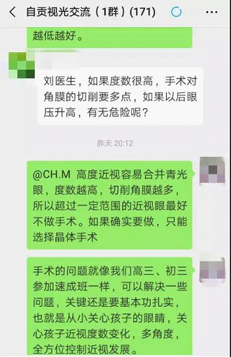 为了更好的服务于近视患者,刘江医生还创立了“刘江视光”公众号、“刘医生视光”微信号、“自贡视光交流”微信群,定期在微信群中和大家交流近视眼相关话题,解答疑惑。