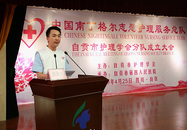 中国南丁格尔志愿护理服务总队自贡市护理学会分队志愿者倪琳杰代表志愿者发言。