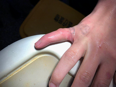 ▲肿胀渗血的小指