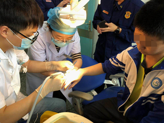情况紧急,陈荧和黎璇把少年赶紧带至诊疗室,运用口腔治疗专用车针,经过近20分钟小心翼翼的切割,终于使受伤的小指得以解脱。