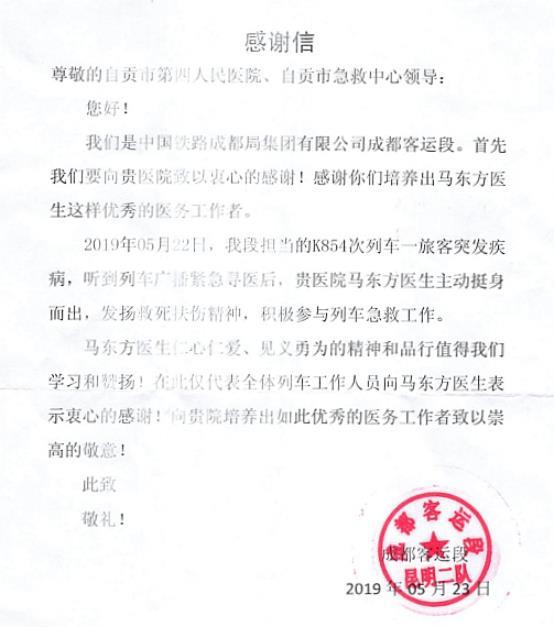 最近一周,自贡市第四人民医院接连收到两封从中国铁路成都局集团有限公司寄来的感谢信,信中要感谢的是同一个人——自贡市第四人民医院呼吸与危重症医学科退休医生马东方。这是怎么一回事呢?