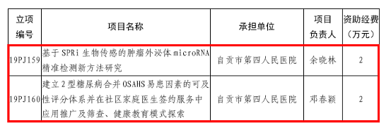 文件中,还对省卫健委科研立项课题进行了公示,自贡市有两项科研重点项目课题立项,均在市四医院产生,分别是临床检验中心主任余晓林、内分泌科主任邓春颖的项目获批立项建设。