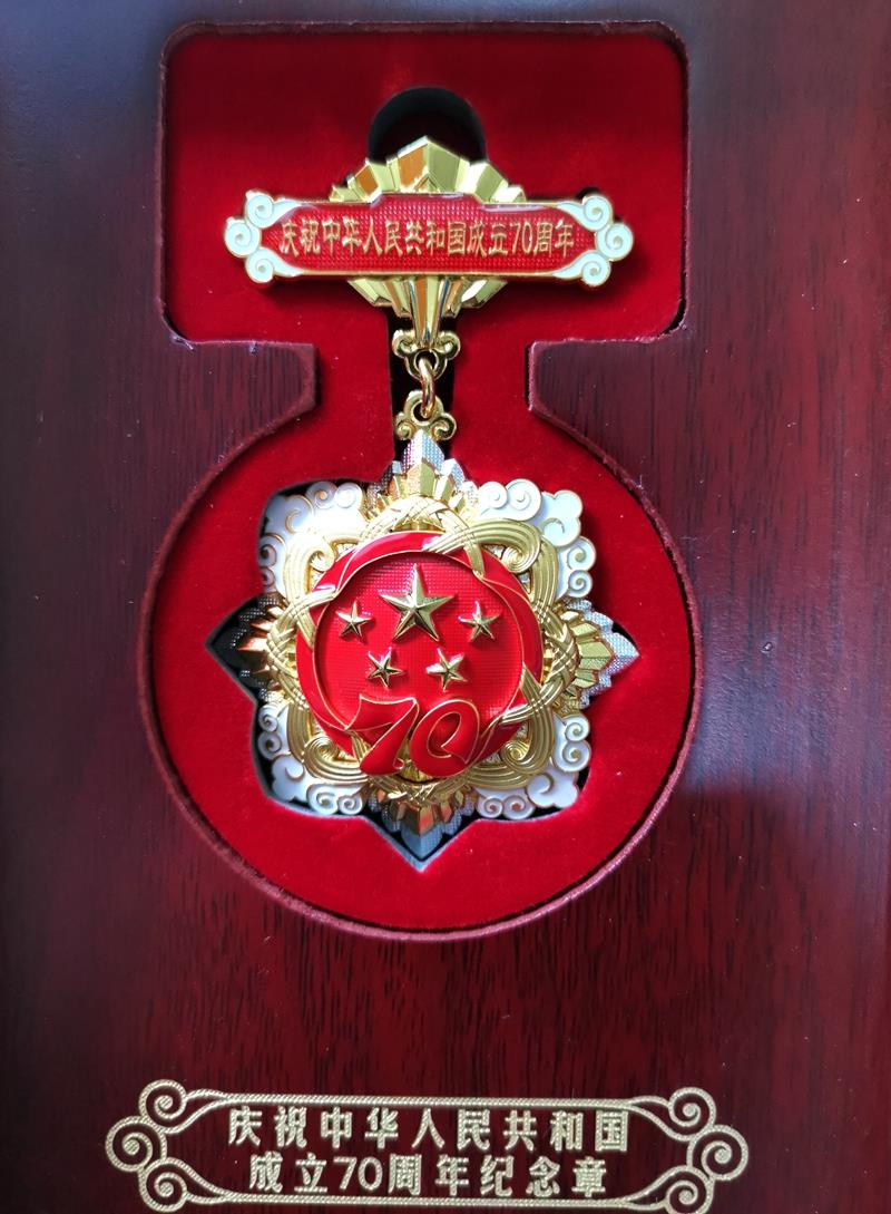 纪念章金光灿灿,通径为50毫米,主要元素为五星、“70”飘带、团锦结、如意祥云和光芒,主色调为红色和金色。核心部分为五星,代表国家荣誉。“70”飘带象征中华人民共和国70年奋斗历程。团锦结环绕在五星和“70”飘带周围,寓意全国各族人民大团结,构建人类命运共同体的愿景。章体外环以如意祥云、光芒构成,象征人民对美好生活的向往,同时表达隆重庆祝中华人民共和国生日,礼赞国家富强、民族振兴、人民幸福的辉煌成就,以及在70年辉煌奋斗成就的基础上不忘初心、继续前进的坚定决心。