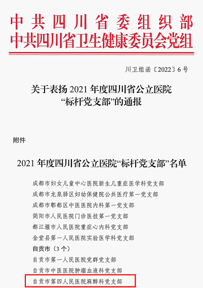 近日,省委组织部、省卫健委党组发文通报表扬2021年度四川省公立医院“标杆党支部”,我院麻醉科党支部位列其中,被评为2021年度四川省公立医院“标杆党支部”。