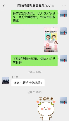 在患者出院前,由责任护士向患者做出院指导,通过口头的宣教、发放健康宣传手册、提供微信肺康复群的二维码以及电话随访,通过简单的交流,给予正确的疾病相关指导,了解患者在出院后的疾病动态,塑造对抗疾病的决心,由于呼吸系统疾病是慢性疾病,我们也为患者提供在肺康复群“预约床位”的便捷呼吸通道,提高患者的就医体验。