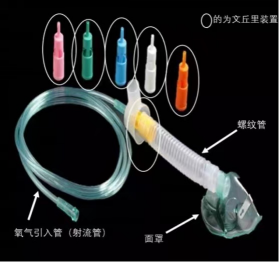 如何正确使用文丘里面罩(venturi mask)时间:2024-12-05 浏览量:12958 来源:自贡市第四人民医院 作者:一、概述 (一)概念: 文丘里面罩是根据文丘里(Venturi)原理制成,即氧气经狭窄的孔道进入面罩时在喷射气流的周围产生负压,携带一定量的空气从开放的边缘流入面罩,面罩边缝的大小改变空气与氧的比率。它是一种高流量给氧装置,可提供的氧浓度为24%~60%[1],能够精确给氧,流量高。它一般由面罩、氧气引入管、文丘里装置、混合气体输送管(螺纹管)等四个部件构成(图1),也有部分厂家的文丘里面罩没有混合气体输送管,仅仅把文丘里装置直接连接到面罩上(图2)。