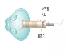 图2文丘里装置直接连接面罩 (二)文丘里原理 文丘里原理较为复杂,其涉及流体物理学中的连续性方程及伯努力原理。即当一定流量的氧气通过横截面积较小的射流孔(图3)后流速增大形成高速气流,产生一定负压,进而卷入周围空气,最终形成高流量的空氧混合气流。[2-3]这种效应就如同当一列高速的火车驶过时,在其周围形成的气流会将路旁的树叶“吸”向列车一样。根据其原理得知,吸入氧浓度与射流孔的孔径、空气流入口径及氧流量大小有关[4]。当我们将射流孔口径、氧流量减小或将空气流入口径增大时,氧浓度会随之减小,反之增大[5](图4)。文丘里面罩喷射入面罩的气流大于病人吸气时的最高流速和潮气量,所以吸氧浓度恒定,因高流速的气体不断冲洗面罩内部,呼出气难以在面罩中滞留,故基本无重复呼吸,在治疗低氧血症伴高碳酸血症的病人需要选择文丘里面罩,能准确地控制好氧浓度。