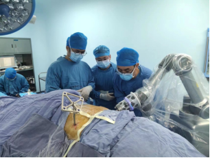 有着一只可六维度灵活转动的手---机械手臂,运动灵活、操作稳定,能达到亚毫米的精度,在它的帮助下,手术有效提高了钉道规划、靶点定位、精密操作的质量,帮助医生完成真正意义上的骨科精准微创手术