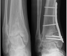 六、踝关节骨关节炎的治疗 踝关节骨关节炎的治疗目标是缓解疼痛、改善关节功能、延缓病情进展。治疗方法包括保守治疗和手术治疗 1.保守治疗(非手术治疗): A一般治疗:适当休息,减少不合理的运动,避免长时间跑、跳、蹲等加重踝关节负担的动作。同时,保持健康的体重(肥胖需减重),佩戴支具减轻踝关节的负荷。 B药物治疗:常用的药物包括非甾体抗炎药(如布洛芬、塞来昔布、依托考昔等)、软骨保护剂(如氨基葡萄糖、硫酸软骨素、玻璃酸钠)等。这些药物可以缓解疼痛、减轻炎症、延缓软骨退变。 C物理治疗:如热敷、冷敷、按摩、针灸、经皮神经电刺激等。这些治疗方法可以增加局部血液循环、减轻炎症反应、改善关节功能。 2.手术治疗: 对于保守治疗无效且病情严重的患者,可能需要考虑手术治疗。手术方法包括关节镜手术清理关节腔、踝关节融合、踝关节置换等。