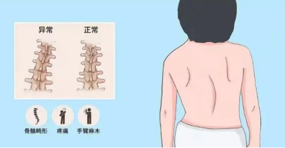 按图观察很简单 家长朋友们可以通过上述两种方式评估孩子是否存在脊柱 侧弯问题,一旦发现异常,及时到医院寻求专业医生的意见。 脊柱侧弯有哪些危害? 1.生理方面:(1)脊柱侧弯会导致孩子肩背不平、腿脚不等长,出现驼背、鸡胸问题,并且身材矮小,活动受限。(2)脊柱侧弯还可能导致胸廓变形、腹腔减小,使孩子出现腰背疼痛、神经受损、消化不良、肢体感觉障碍等。(3)脊柱侧弯还会影响孩子的心肺功能,甚至出现肺动脉高压。(4)脊柱侧弯还可能引起消化不良、食欲不振等问题。 2.心理方面:长期脊柱侧弯很容易使孩子出现自卑心理。 治疗方案有哪些? 1.手法推拿:如果孩子脊柱侧弯问题不是很严重,可以通过中医手法推拿治疗,借助中医整脊正骨技术,放松调整不平衡肌肉,借助手法调整修复凸出节段,使其逐渐恢复正常。 2.体操运动:建议孩子们在康复医师的指导下做脊柱体操,对薄弱环节的肌肉力量进行训练,以此改善脊柱侧弯问题。 3.矫形器支具治疗:如果脊柱侧弯范围在20°-40°之间,建议佩戴矫形器支具进行治疗。 4.呼吸训练:在脊柱侧弯患儿群体中进行呼吸训练,能够帮助孩子调整呼吸,使其呼吸肌力量增强,这对恢复呼吸功能非常有帮助。 5.电刺激治疗:在脊柱侧弯临床治疗中,电刺激作为一种辅助手段应用普遍,其能够对肌紧张问题进行有效调整。 6.手术治疗:针对先天性脊柱侧弯儿童和脊柱侧弯超过40°的儿童来说,手术治疗无疑是最理想的方式。 脊柱侧弯应该如何预防? 青少年可以这样做: 1.关注自己脊柱健康情况,如有颈肩腰背不舒适的情况,及时告知家长和老师。 2.合理安排学习和休息时间,控制电子产品使用时间。 3.增加身体活动和体育锻炼,适当增加护脊运动。 4.改变久坐行为,纠正不良站姿和坐姿,不要跷二郎腿。 家长可以这样做: 1.督促孩子养成良好的坐姿、站姿、睡姿、行走姿势,并形成习惯。 2.以身作则,帮助孩子规划和控制每天的电子产品使用时间和学习时间,陪伴孩子加强体育锻炼。 3.帮助孩子正确选择及使用背包,建议使用双肩式背包,保证双肩重量尽量相等。 4.为孩子选择合适的床,不能太软,枕头不能过高,推荐睡硬板床。 5.为孩子提供营养均衡、有益于骨骼健康的膳食。 6.如孩子出现颈肩腰背不舒适的情况,及时就医。 温馨提示: 脊柱侧弯的特点决定了在日常生活中预防比治疗更加重要。家长朋友们要了解脊柱侧弯是怎么形成的,明确脊柱侧弯的危害,学会筛查,观察自家孩子是否存在脊柱侧弯问题,并在医生的指导下进行科学治疗及预防,将脊柱侧弯的危害降到最低,保障孩子的健康成长及发育。