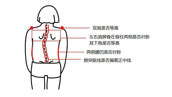 如何快速筛查脊柱侧弯? 1.后背观察法:让孩子脱掉上衣,把上半身暴露出来,背对检查者,自然站立,双眼平视前方,双臂自然下垂。观察孩子的双侧肩膀是否一样高,肩胛骨是否对称,是否存在肩胛骨过于突出的情况,还要查看背部双侧腰线对称、骨盆等高、臀部对称等一系列问题。