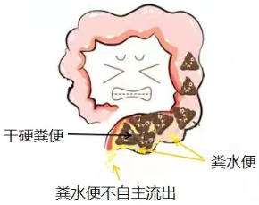 假腹泻,真便秘:藏在稀便里的肠道危机时间:2025-06-25 浏览量:5071 来源:自贡市第四人民医院 作者:门诊或骨科、神经外科等科室会诊,常常遇到主诉腹泻的病人,严重者大便失禁。患者长期卧床,最初便秘,突发或一次泻药后便一泻不止。有的病人还会出现腹痛腹胀、便血。遇到这种情况,病人和医生都苦不堪言。于医生而言,意味着可能再次成为掏粪工。 这种看似矛盾的病症,正是假性腹泻,本质为便秘,即“假腹泻,真便秘”。医学上也称为溢出性腹泻、积粪性腹泻或矛盾性腹泻。 一、定义 假性腹泻是指排便时由于粪块嵌塞于直肠内难以排出,但有少量水样、稀塘样粪质绕过粪块从肛门排出,酷似“腹泻”,这种酷似“腹泻”的表现容易被误诊,所以称之为假性腹泻。 二、发生机制:肠道里的“堰塞湖效应” 当硬结的粪块在直肠或乙状结肠形成嵌塞时,就像在肠道里筑起一道堤坝。上游肠腔在持续分泌消化液的过程中不断扩张,气体液体不能通畅排出,病人会自觉腹胀,甚至出现腹部阵发性绞痛。 粪块长时间在直肠嵌塞,粪块中的水分逐渐被直肠黏膜吸收,粪块越来越干硬。粪块嵌塞于肛管和直肠下段难以排出,影响肛门自制功能。同时嵌塞的粪块压迫和刺激直肠黏膜,导致直肠黏膜水肿、糜烂,黏液和分泌物增多,甚至出现粘液血便。在肛门自制功能受影响、肛门闭合不严的情况下,粪水、黏液和分泌物就会从嵌塞的粪块两侧流出肛外,形成“假性腹泻”。